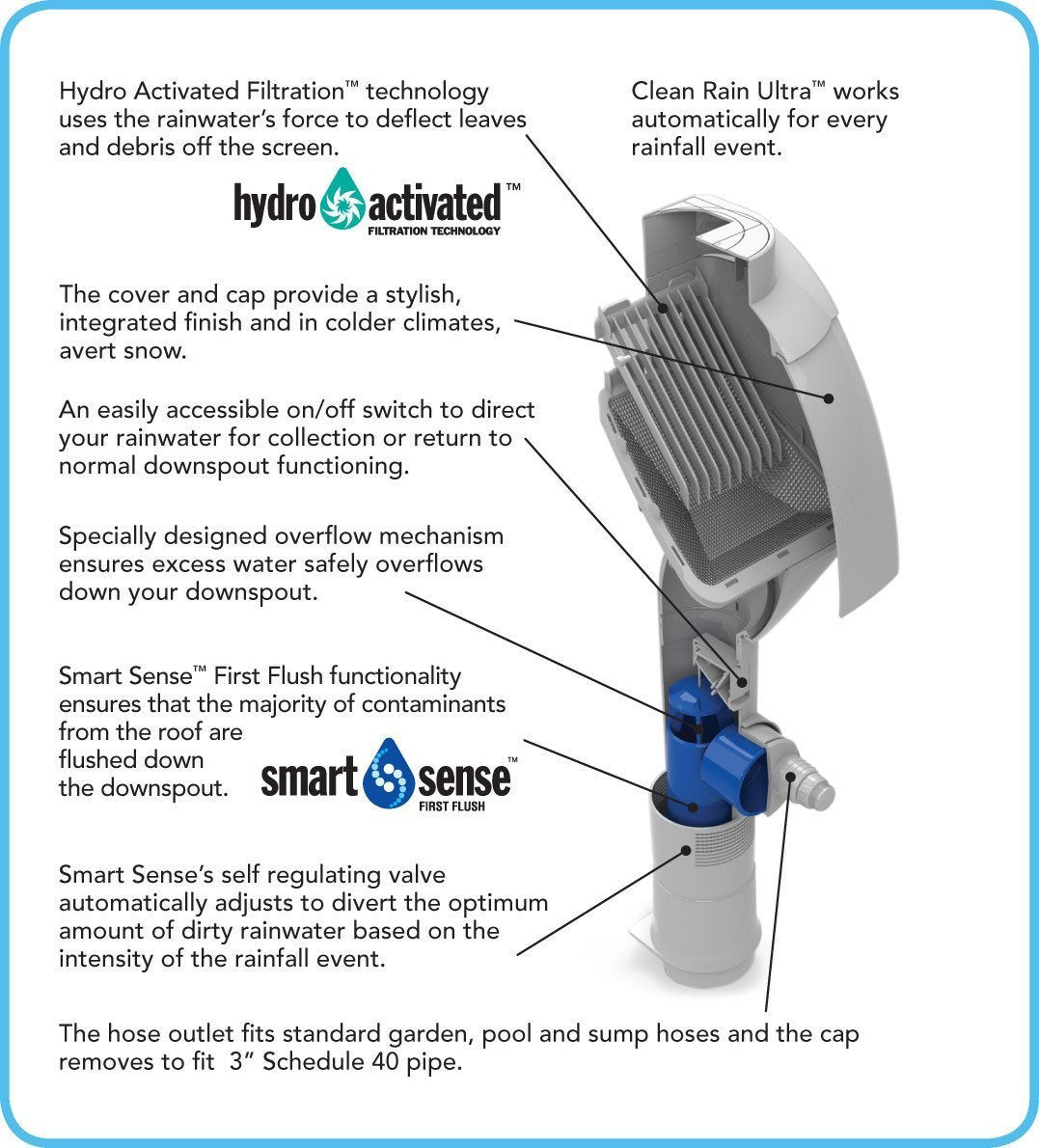 Also, the safety overflow diverts extra rainwater back to the down spout. An easily accessible allows you to turn the system on or off, returning the flow to the down-spout, bypassing your rain harvesting system any time you like.