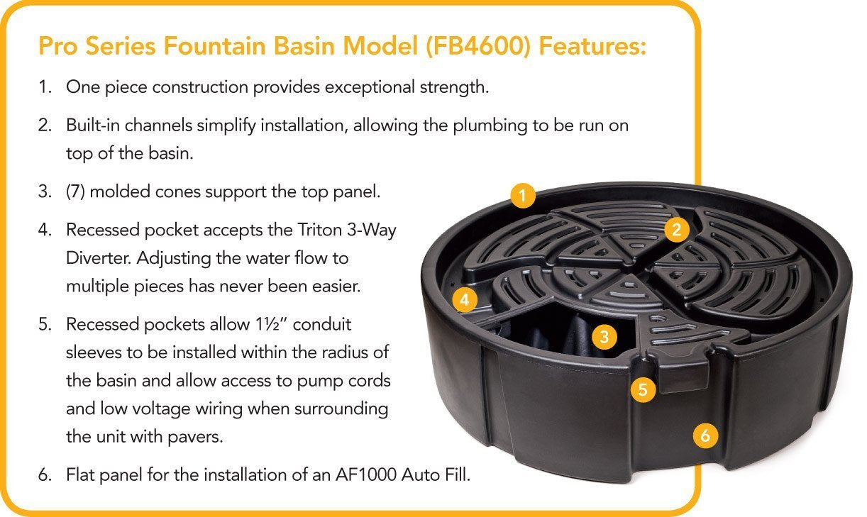 When they were introduced, Atlantic Fountain Basins were already the strongest and best-designed on the marketplace, featuring deep plumbing channels on the top of the basin, easy access pump chambers and external flow adjustment for convenient installation and maintenance. Now they're even better, with new internal buttressing cones for greater rigidity . Count on Atlantic to keep on performing!