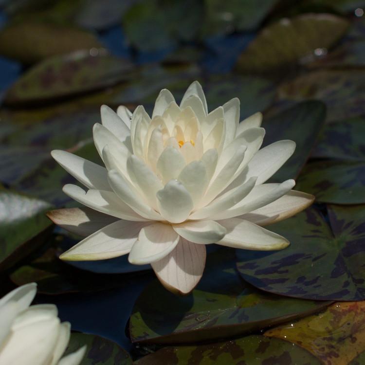 This lily is a white/yellow and has peony shaped flowers about 4 inches big. The green leaves have a red tint at their edges. When grown in full sun it will be between 2-6 feet wide. Should be in water that is 6-24 inches deep. Great plant for medium sized water gardens.